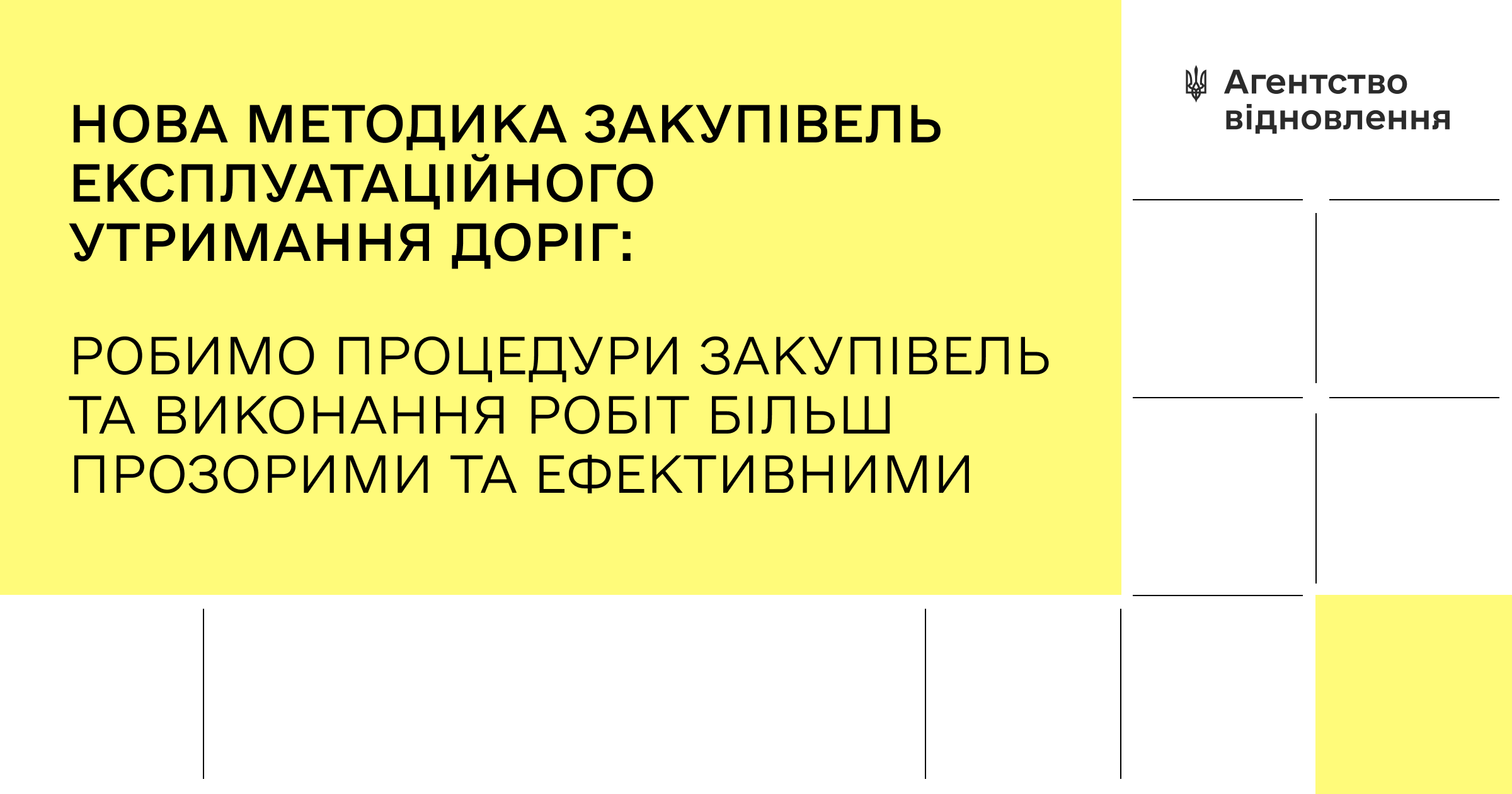 Агентство відновлення запровадило нову методику закупівель експлуатаційного утримання доріг, яка зробить процедури закупівель та виконання робіт більш прозорими та ефективними, дозволить збільшити конкуренцію та обрати надійні та спроможні компанії.